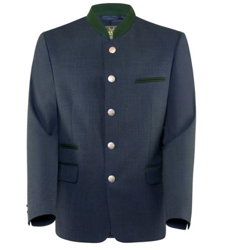 Zeitlos, elegante Ausführung. Kragen mit grünem Tuchlodenbesatz und dezenter Paspelierung an den Schultern. Falte mit Dragoner am Rückenteil, Metallknöpfe.Qualität: